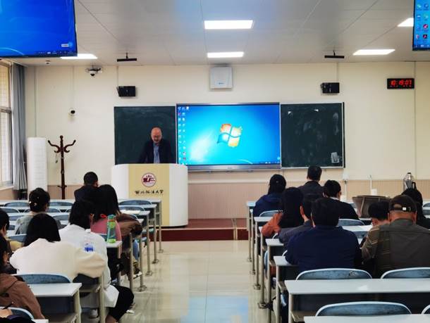 经理助理俞秀玲就学院涉外事务进行部署。她介绍了学校层面的五项涉外指标以及学院自主选择承担的五项涉外指标,计划争取教师赴国(境)外研学、邀请国(境)外专家举办四场讲座等。