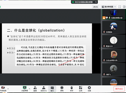 本次观摩教学,《当代西方社会思潮》的授课内容为全球化理论。课堂伊始,张兴娟老师先以提问方式带领同学们回顾了“新自由主义思潮”概念,然后开始学习本节课主要学习内容,张兴娟老师主要讲解了全球化概念的定义、三个发展时期以及带来的负面影响等,延伸讲解了全球化理论先驱费里德曼的“全球化体系论”等理论;接下来张兴娟老师组织同学们分组讨论,同学们纷纷发言,就劳工全球化、移民全球化、难民全球化等问题进行热烈讨论。
