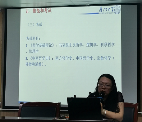 厦大哲学系张会永副主任介绍了厦门大学这所蜚声国内外的名校概况,重点介绍了哲学系的发展状况,1922年成立哲学系,至今已有百年历史,实行系、所、中心合一的管理体制,目前是本硕博同时培养的模式,哲学学科为省重点学科,教学方面紧跟国家形势,申请到了强基班(全国十八所高校才有次殊荣)。