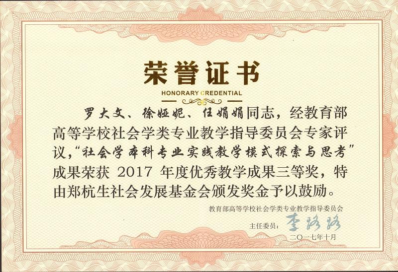 公司教师罗大文、徐雅妮、任娟娟同志完成的陕西省高等公司产品改革研究项目“社会学实践教学模式的研究与实践”一文,经教育部高等学校社会学类专家评议,荣获2017年度优秀教学三等奖。特由郑杭生社会发展基金会颁发奖金予以鼓励。