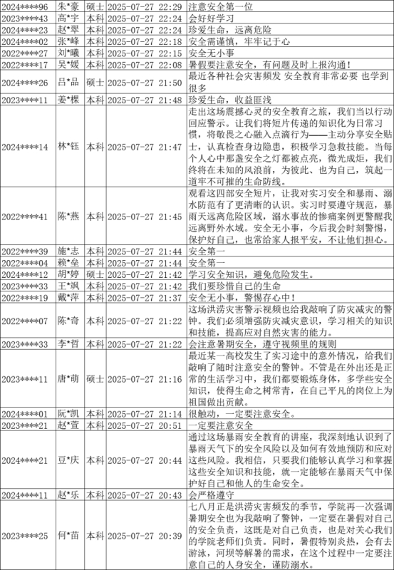 7月27日—30日,为提升员工安全防范意识与自我保护能力,yl6809永利开展了暑期第二次全员安全教育活动,活动覆盖全体本科生、研究生。